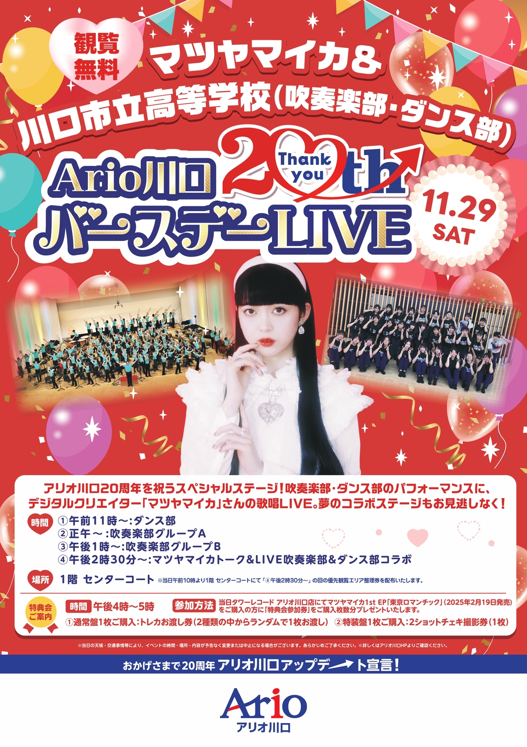 11月29日(土)アリオ川口にて開催される「マツヤマイカ&川口市立高等学校(吹奏楽部&ダンス部)アリオ川口20thバースデーライブ」イベントにて特典会の実施が決定しました!