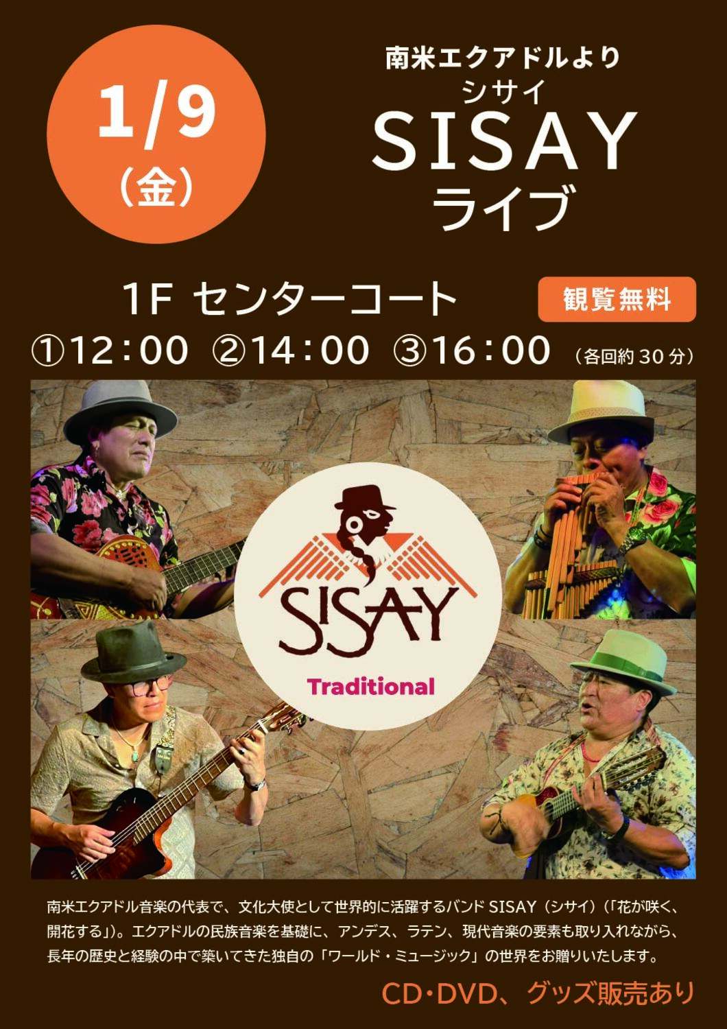 南米エクアドル音楽の代表で、文化大使として世界的に活躍するバンドSISAY(シサイ)(「花が咲く、開花する」)。エクアドルの民族音楽を基礎に、アンデス、ラテン、現代音楽の要素も取り入れながら、長年の歴史と経験の中で築いてきた独自の「ワールド・ミュージック」の世界をお贈りいたします。