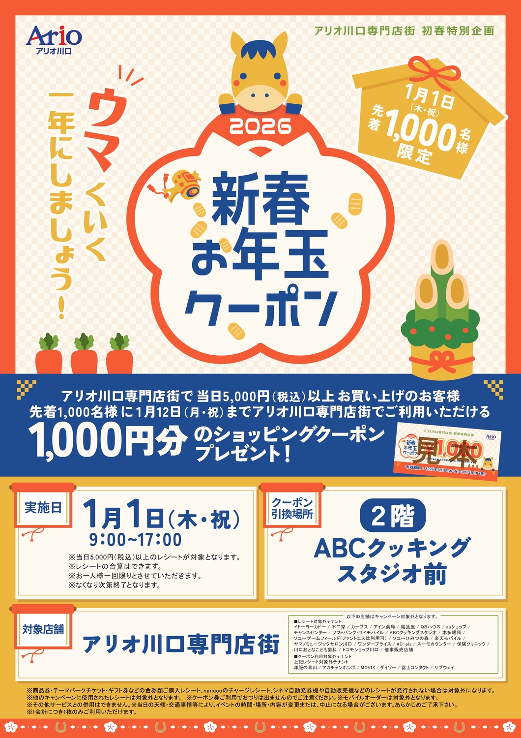 先着1,000名様に1月12日(月・祝)までアリオ川口専門店街でご利用いただける1,000円分のショッピングクーポンをプレゼント!