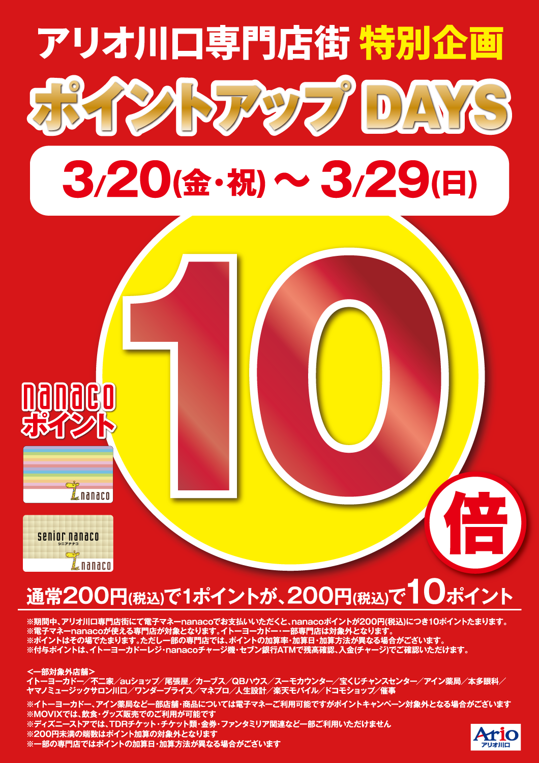 3/20(金)~3/29(日)の期間中、アリオ川口専門店街にてnanacoカードでお支払いいただくと、