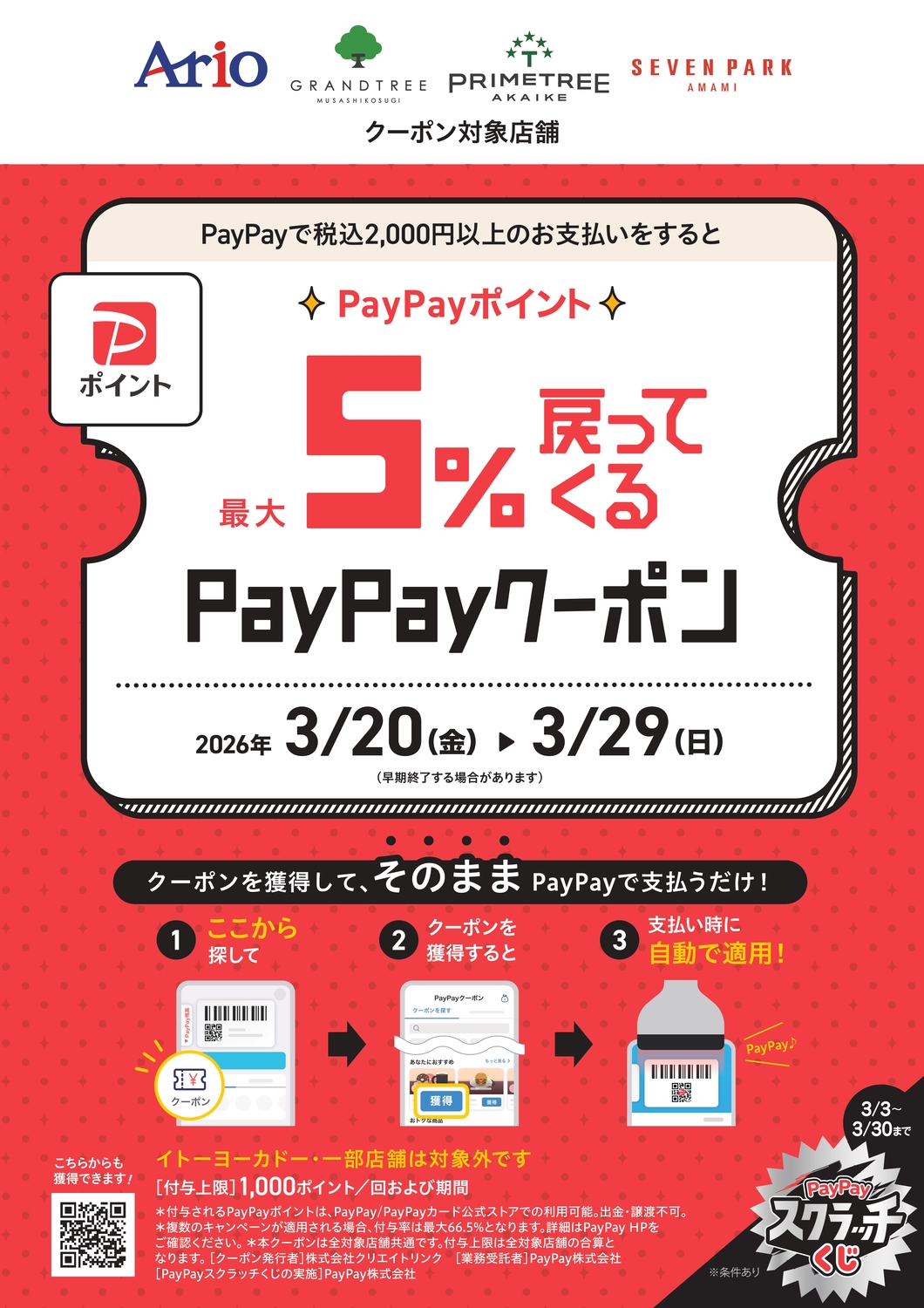 アリオ、グランツリー武蔵小杉、プライムツリー赤池、セブンパーク天美で5%戻ってくるお得なクーポン
