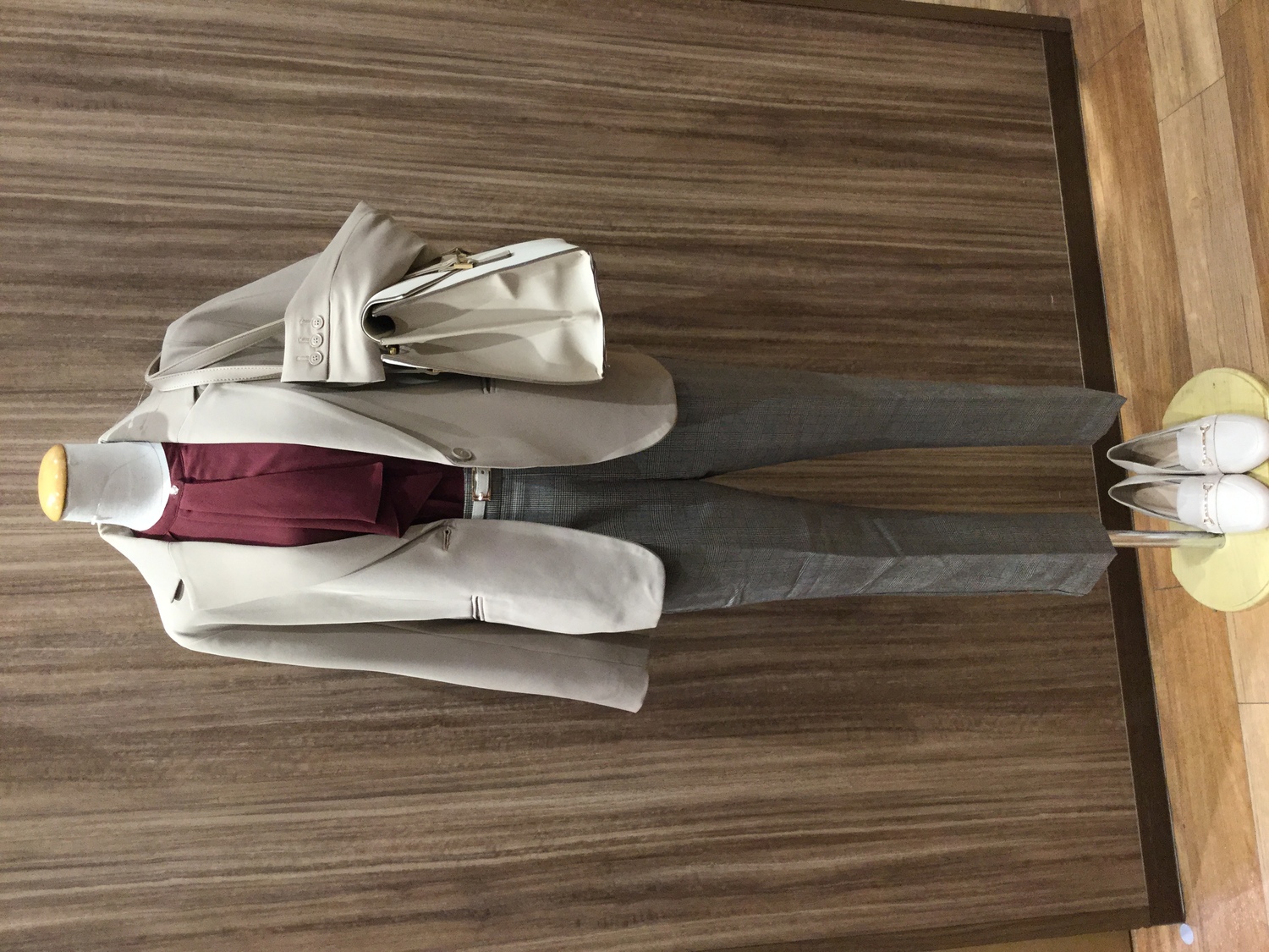 上品なベージュジャケットに、チェック柄パンツを合わせた大人きれいめコーデ!