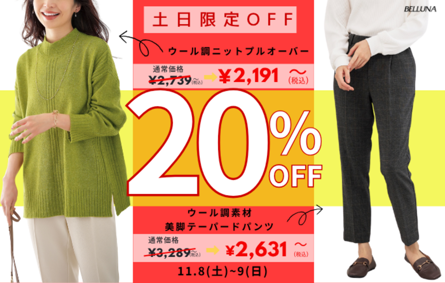 今週土日は「ウール調ニットプルオーバー」&「ウール調素材美脚テーパードパンツ」が20%OFFで買えるチャンス!