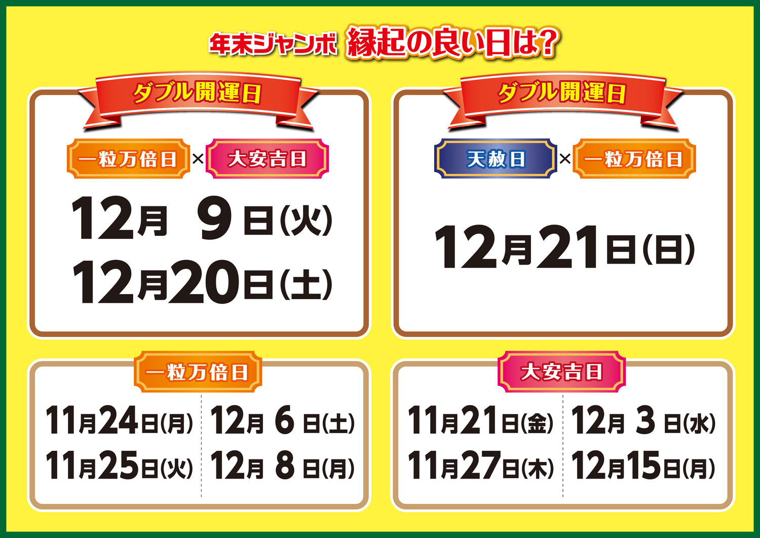 また同時発売されます「年末ジャンボミニ」は1等前後賞合わせて5千万円が最大150本となっております。縁起の良い日に、2種類の「年末ジャンボ宝くじ」のご購入はいかがですか。