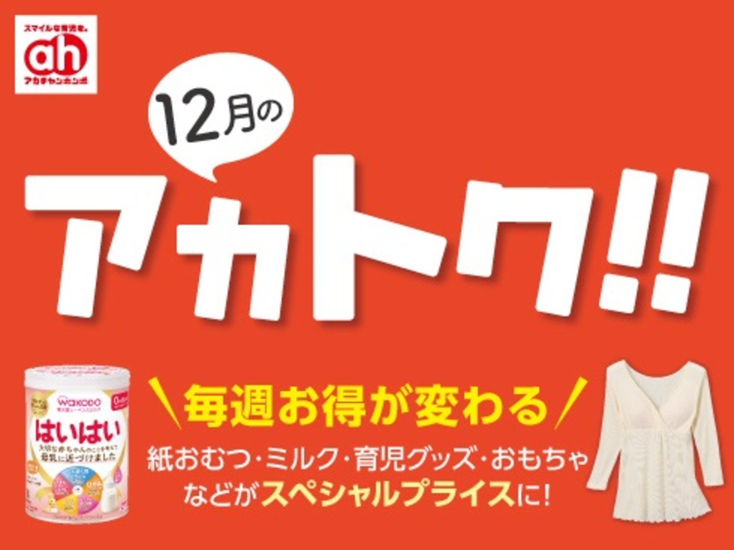 今月のアカトク!! 紙おむつ・粉ミルク・おもちゃ・育児雑貨などがお買得! スペシャルプライスのアカトクを要チェック! いつも使っているあの商品をお得にゲットしよう♪