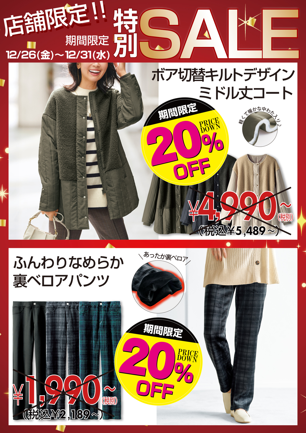 12/26(金)~12/31(水)は「ボア切替キルトデザインミドル丈コート 」・「ふんわりなめらか裏ベロアパンツ」が20%OFFで買えるチャンス!